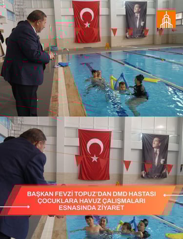BAŞKAN FEVZİ TOPUZ’DAN DMD HASTASI ÇOCUKLARA HAVUZ ÇALIŞMALARI ESNASINDA ZİYARET